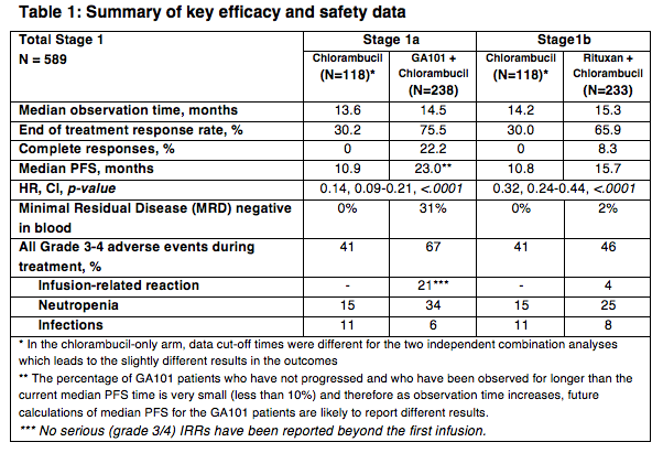 GA101 combined with chlorambucil demonstrated a significant 86 percent reduction in the risk of disease progression, relapse or death. Additionally, the length of time during which people lived without their disease worsening (median progression-free survival, PFS) was more than doubled (23 months compared to 10.9 months, HR=0.14, 95 percent CI 0.09-0.21, p<.0001) when compared to chlorambucil alone. The full data, including the comparison of Rituxan plus chlorambucil with chlorambucil alone will be presented in an oral session at the 49th Annual Meeting of the ASCO in Chicago on Tuesday, June 4.